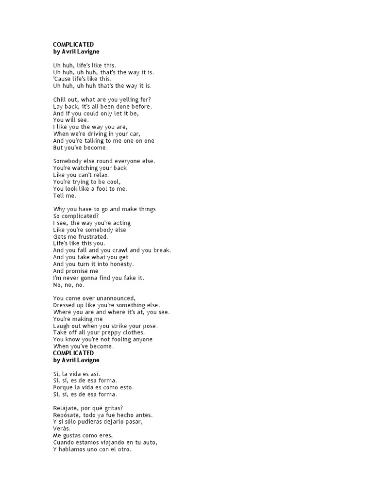 The song was released on May 14 2002. Complicated - Avril Lavigne Übersetzung und Songtext Lyrics Musik-Videos und Liedtexten kostenlos. Avril Lavigne - Complicated Piano Tutorial.